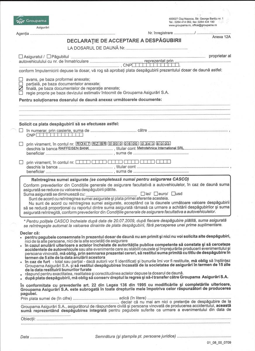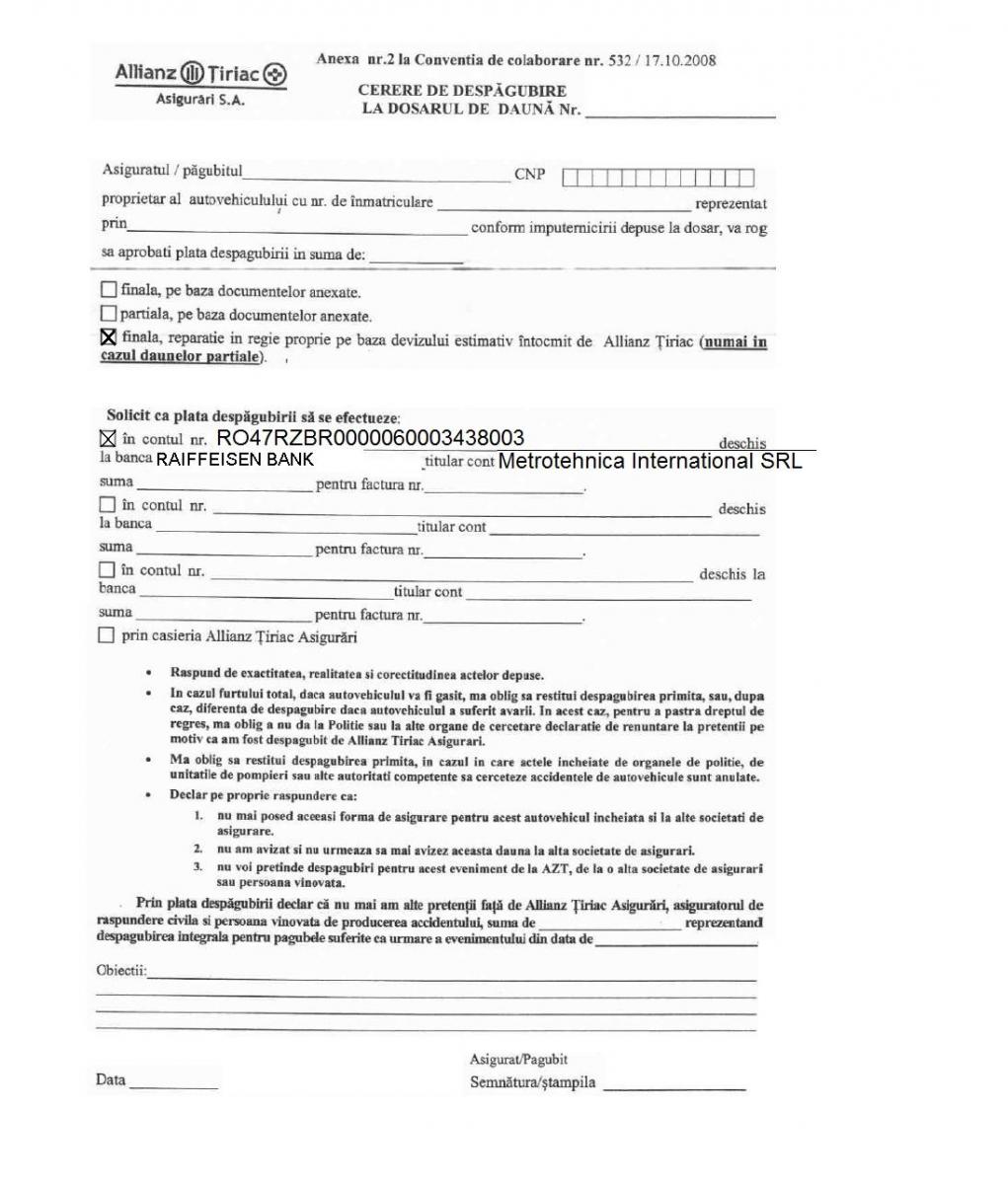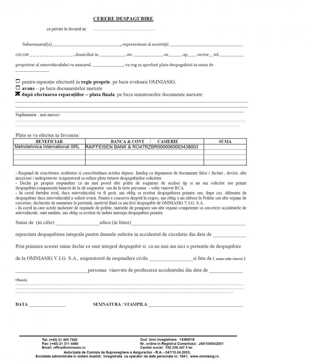 ◊ BONUS 5% din valoarea facturii de daune, decontate de Asigurator, pentru orice lucrare sau achiziţie viitoare la Service Metrotehnica.